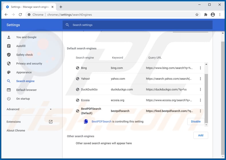 Therefore, bestpdfsearch.com can be removed from settings only when BestPDFSearch is no longer installed. Browser hijackers also collect data such as IP addresses, geolocations, addresses of visited websites, entered search queries, etc. Some browser hijackers can record personal, sensitive information as well.
