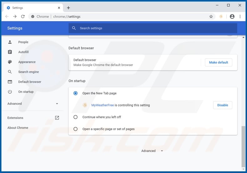 (at the top right corner of Google Chrome), select "Settings". In the "On startup" section, disable "MyWeatherFree", look for a browser hijacker URL (hxxp://www.softsquare.net) below the “Open a specific or set of pages” option. If present, click on the three vertical dots icon and select “Remove”.