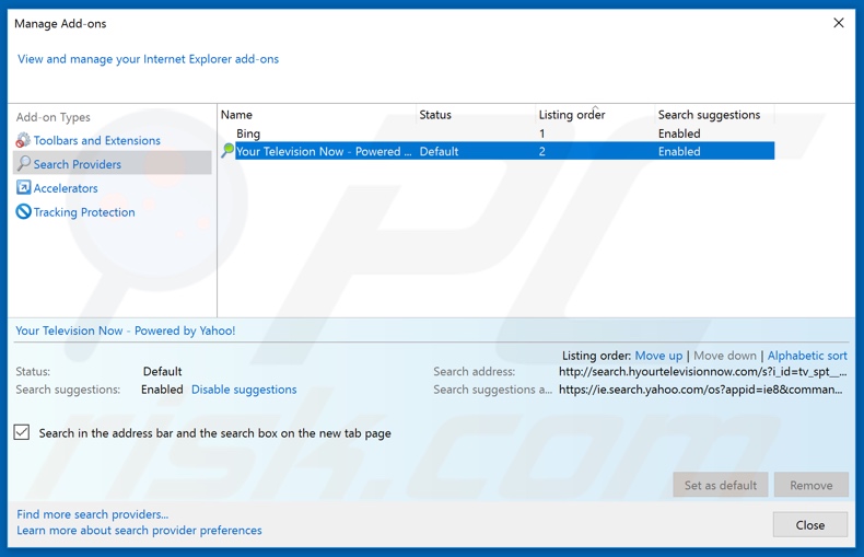(at the top right corner of Internet Explorer), select "Manage Add-ons". In the opened window, select "Search Providers", set "Google", "Bing", or any other preferred search engine as your default and then remove "Search".