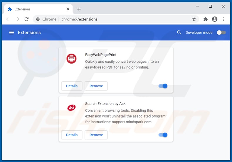 (at the top right corner of Google Chrome), select "More tools" and click "Extensions". Locate "EasyWebPagePrint" and other recently-installed suspicious browser add-ons, and remove them.