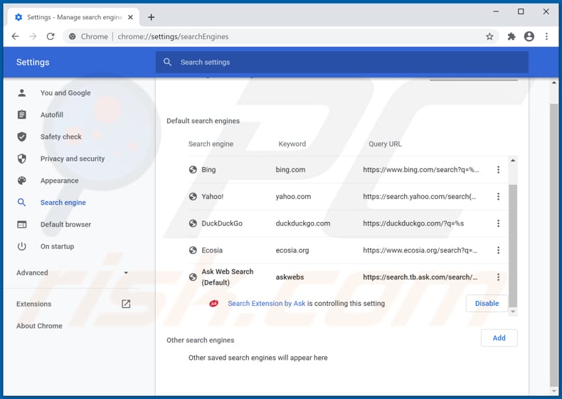 (at the top right corner of Google Chrome), select "Settings", in the "Search engine" section, click "Manage search engines...", in the opened list look for "Ask Web Search", and when located click the three vertical dots near this URL and select "Remove from list".