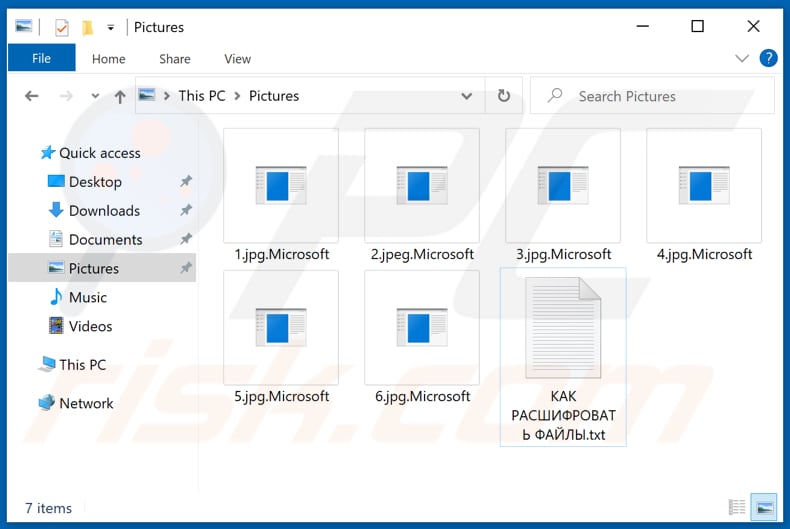 It renames files by appending the ".Microsoft" extension to filenames. For example, "1.jpg" is changed to "1.jpg.Microsoft", "2.jpg" to "2.jpg.Microsoft", and so on. 'Microsoft' also creates a ransom message within "КАК РАСШИФРОВАТЬ ФАЙЛЫ.txt" text files in all folders that contain encrypted files, and displays another with identical text in a pop-up window.