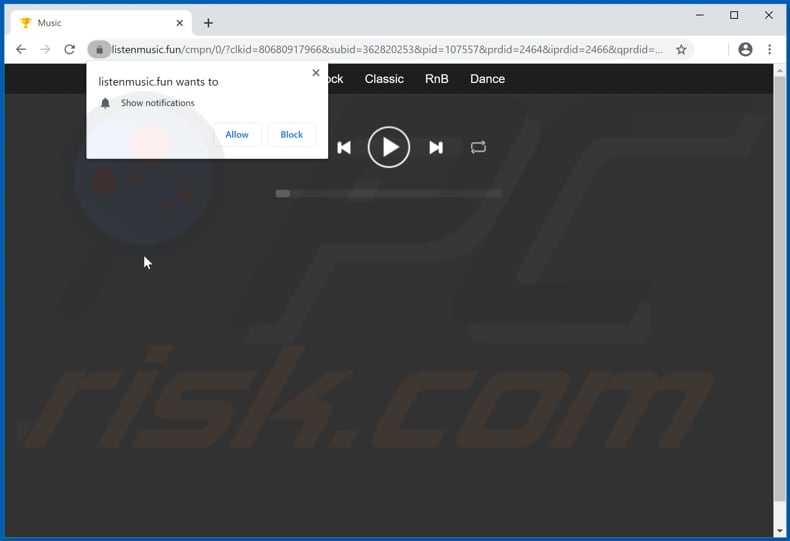 PUAs open sites such as listenmusic[.]fun in new browser windows or tabs. Once visited, these bogus websites display dubious content or open about two or three other bogus websites - this depends on the geolocations of their visitors. Most attempt to trick users into allowing them to show notifications by using 'clickbait' techniques.