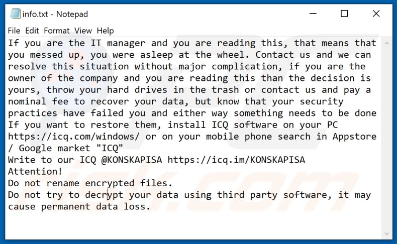 The ransom messages generated by ELDAOSLA states that only the developers have valid decryption tools. To receive instructions about how to purchase these tools, victims must find and contact the KONSKAPISA user on ICQ (a cross-platform messenger), and provide their IDs (listed in the pop-up window).