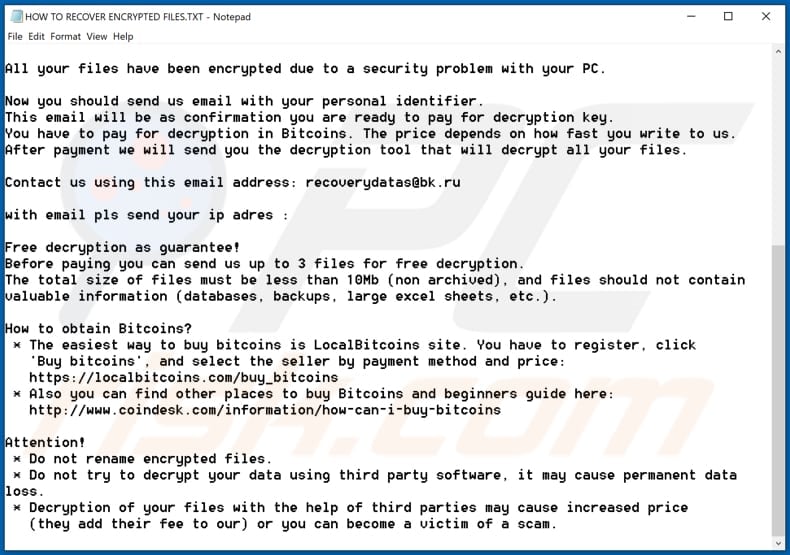 The "HOW TO RECOVER ENCRYPTED FILES.TXT" text file contains instructions about how to contact the cyber criminals behind Recoverydatas ransomware. The message states that victims must send their assigned IDs to the recoverydatas@bk.ru email address and await further details such as cost of decryption key and how to purchase it.