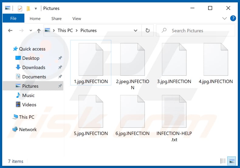 INFECTION encrypts files, renames them by appending the ".INFECTION" extension to filenames, and creates the "INFECTION-HELP.txt" text file (ransom message) in all folders that contain encrypted files. For example, "1.jpg" is renamed to "1.jpg.INFECTION", "2.jpg" to "2.jpg.INFECTION", and so on.