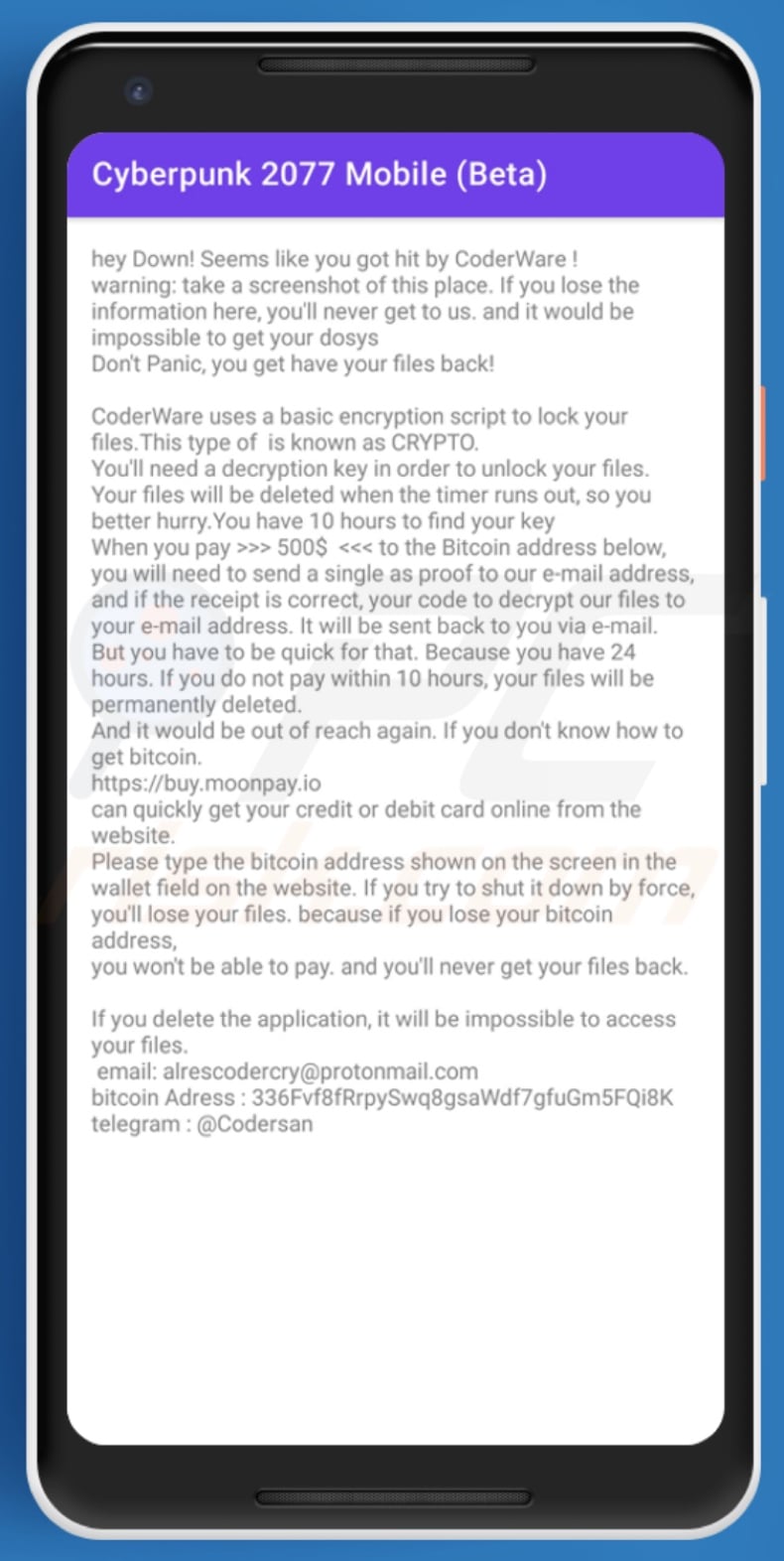 Cyberpunk 2077 mobile ransomware is a malicious application and the Android version of CoderWare ransomware. This malware is designed to encrypt the data stored in Android operating systems in order to make ransom demands for decryption tools.