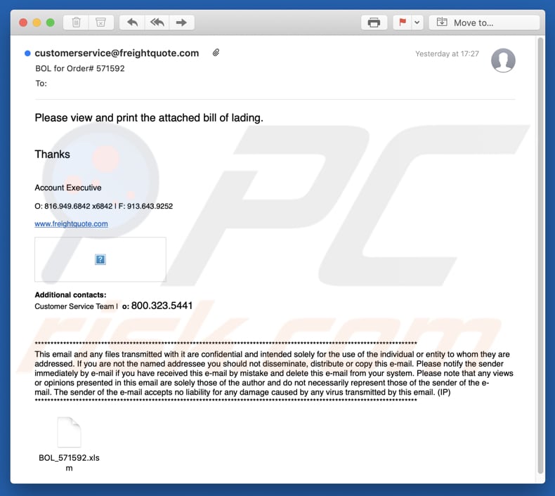 This email is disguised as a message from Freightquote and contains an attachment, supposedly a bill of lading.
