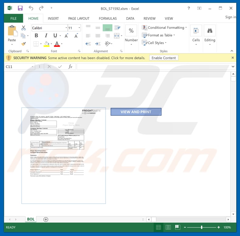 The attachment within this email called "BOL_571592.xlsm" (the filename might vary) installs Dridex after it is opened and macros commands (editing/content) within it are enabled.