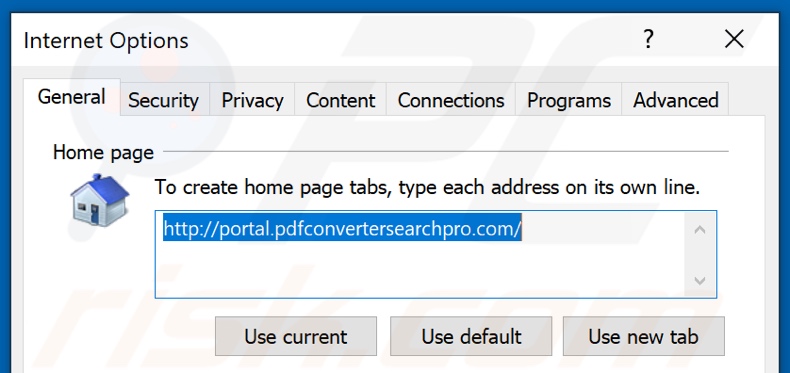 (at the top right corner of Internet Explorer), select "Internet Options", in the opened window remove hxxp://pdfconvertersearchpro.com and enter your preferred domain, which will open each time you launch Internet Explorer. You can also enter about: blank to open a blank page when you start Internet Explorer.