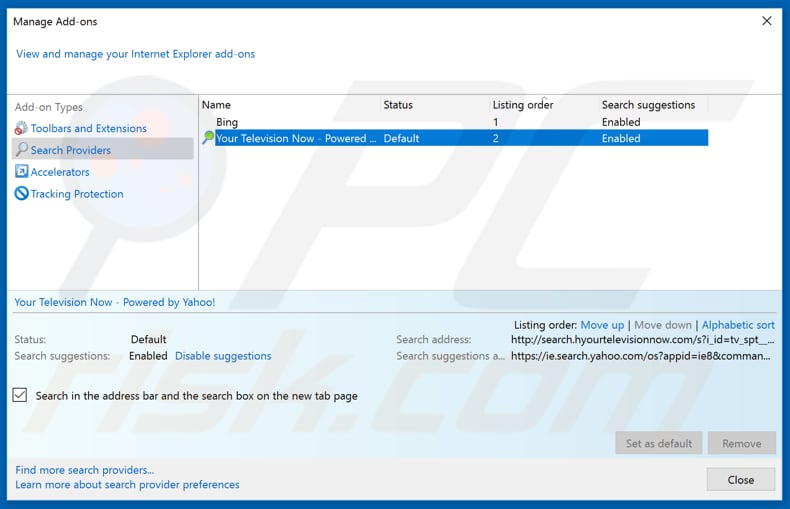 (at the top right corner of Internet Explorer), select "Manage Add-ons". In the opened window, select "Search Providers", set "Google", "Bing", or any other preferred search engine as your default and then remove "PDFSearchWeb".