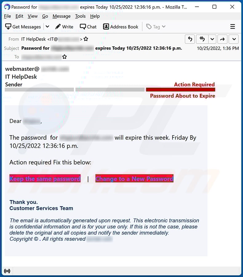 Phishing/ScamAlso Known As: Password Is About To Expire Today spam