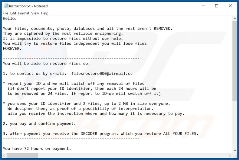 This, however, is rare. In most cases, ransomware infections deliver more direct messages simply stating that data is encrypted and that victims must pay some sort of ransom. Note that ransomware-type infections typically generate messages with different file names (for example, "_readme.txt", "READ-ME.txt", "DECRYPTION_INSTRUCTIONS.txt", "DECRYPT_FILES.html", etc.). Therefore, using the name of a ransom message may seem like a good way to identify the infection. The problem is that most of these names are generic and some infections use the same names, even though the delivered messages are different and the infections themselves are unrelated. Therefore, using the message filename alone can be ineffective and even lead to permanent data loss (for example, by attempting to decrypt data using tools designed for different ransomware infections, users are likely to end up permanently damaging files and decryption will no longer be possible even with the correct tool).