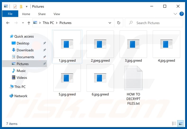 During the encryption process, affected files are appended with the ".greed" extension. For example, a file initially named something like "1.jpg" would appear as "1.jpg.greed", "2.jpg" as "2.jpg.greed", "3.jpg" as "3.jpg.greed", and so on.