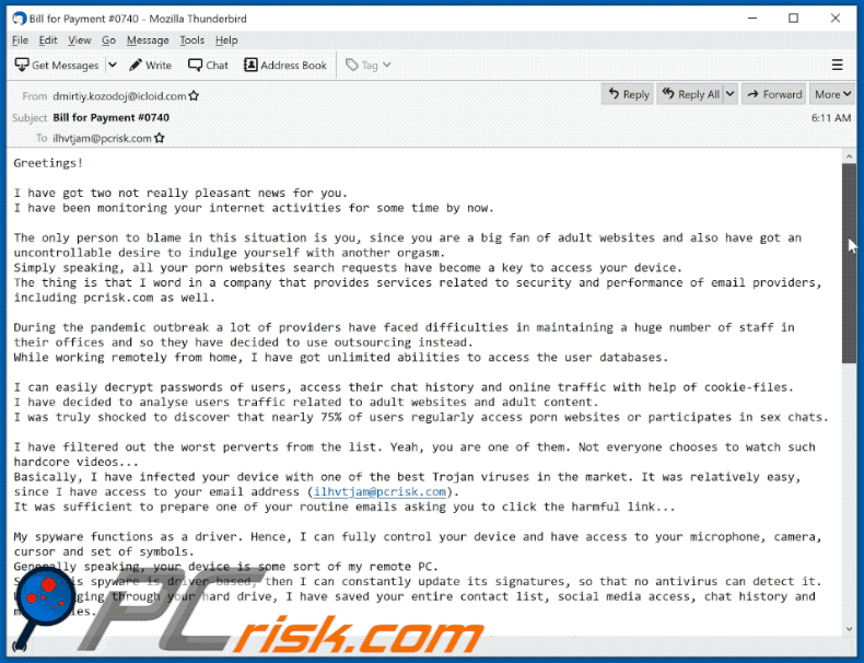 The "I have got two not really pleasant news for you" scam letters (subject/title "Bill for Payment #0740"; may vary) claim that the sender has been monitoring the recipients' Internet activities for a while. This was made possible through spyware trojans with which the recipients' devices have allegedly been infected.