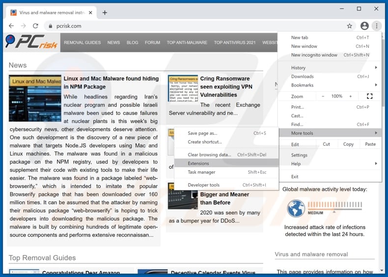 (at the top right corner of Google Chrome), select "More tools" and click "Extensions". Locate all recently-installed suspicious browser add-ons and remove them.