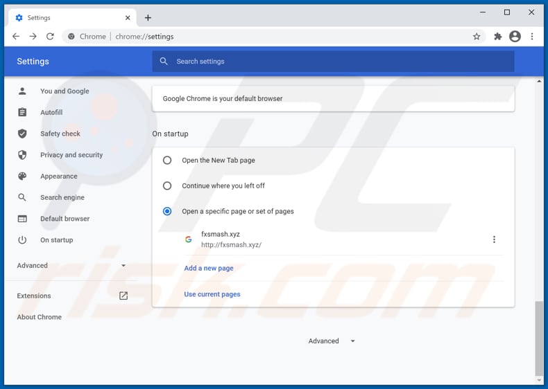 (at the top right corner of Google Chrome), select "Settings". In the "On startup" section, disable "Note mini", look for a browser hijacker URL (hxxp://www.fxsmash.xyz) below the “Open a specific or set of pages” option. If present click on the three vertical dots icon and select “Remove”.