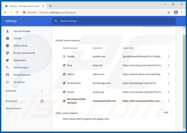 Browser hijackers reassign browsers' default search engine, new tab/window, and homepage URLs - to illegitimate web searcher addresses. MovieSearchZilla operates in this manner. Therefore, with this piece of software installed: new browser tabs/windows opened and web searches performed via the URL bar - redirect to moviesearchzilla.com.