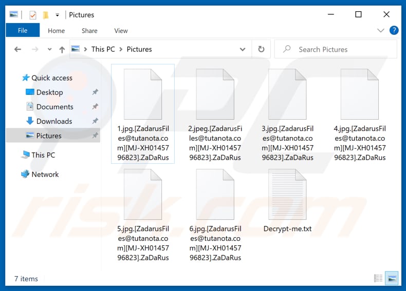For example, it renames a file named "1.jpg" to "1.jpg.[ZadarusFiles@tutanota.com][MJ-XH0145796823].ZaDaRus", "2.jpg" to "2.jpg.[ZadarusFiles@tutanota.com][MJ-XH0145796823].ZaDaRus", and so on. ZaDaRus also creates the "Decrypt-me.txt" file (its ransom note) in folders containing affected (encrypted) files.