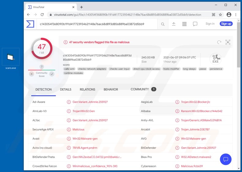 | Detection Names | Avast (Win32:Malware-gen), BitDefender (Gen:Variant.Johnnie.255927), ESET-NOD32 (A Variant Of Win32/VB.RUJ), Kaspersky (Trojan-Ransom.Win32.Blocker.goxb), Microsoft (Trojan:Win32/Fareit!ml), Full List Of Detections (VirusTotal) |