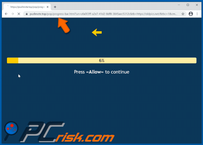 It is known that pushnote[.]top can load a message asking to click the "Allow" button to continue loading the page. This page suggests that it cannot be loaded unless visitors agree to get its notifications.