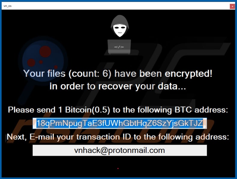 As written in Vn_os's ransom notes, victims have to pay one Bitcoin to the provided BTC wallet address to get a decryption tool. After the payment victims have to send the transaction ID to the vnhack@protonmail.com email address. It is worth mentioning that "___RECOVER__FILES__.vn_os.txt" files contain a list of encrypted files.