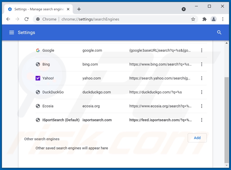 Browser hijackers reassign browsers' homepage, default search engine, and new tab/window URLs - to fake web searcher addresses. These alterations seriously affect the browsing quality. To elaborate, with ISportSearch installed: new browser tabs/windows opened and search queries typed into the URL bar - redirect to isportsearch.com.