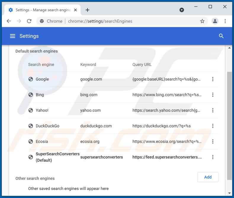 (at the top right corner of Google Chrome), select "Settings", in the "Search engine" section, click "Manage search engines...", in the opened list look for "supersearchconverters.com", when located click the three vertical dots near this URL and select "Remove from list".