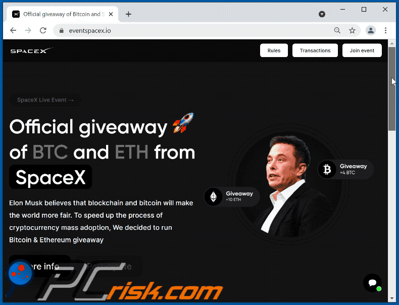 The "SpaceX BTC and ETH giveaway" scam is a program allegedly created by the SpaceX company and its founder Elon Musk. It must be emphasized that neither the aerospace and communications company nor the entrepreneur and business magnate in question - are associated with this scheme. Scammers often incorporate the names of real people or entities to create the impression of legitimacy.