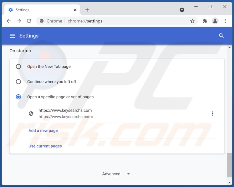 (at the top right corner of Google Chrome), select "Settings". In the "On startup" section, disable "Key Omni", look for a browser hijacker URL (hxxp://www.keysearchs.com) below the “Open a specific or set of pages” option. If present click on the three vertical dots icon and select “Remove”.