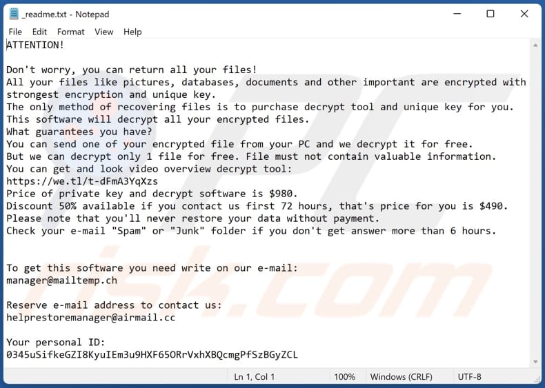 Also, the ransom note encourages victims to contact cybercriminals within 72 hours. Victims will have to pay $980 instead of $490 if they contact the attackers in the given time frame. Before paying a ransom, victims can send one encrypted file and receive it decrypted for free. That file cannot contain valuable information.