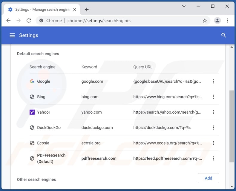(at the top right corner of Google Chrome), select "Settings". In the "On startup" section, disable "PDFFreeSearch", look for a browser hijacker URL (hxxp://www.pdffreesearch.com) below the “Open a specific or set of pages” option. If present click on the three vertical dots icon and select “Remove”.