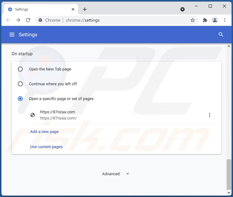 (at the top right corner of Google Chrome), select "Settings". In the "On startup" section, disable "remain dark", look for a browser hijacker URL (hxxp://www.87nzaa.com) below the “Open a specific or set of pages” option. If present click on the three vertical dots icon and select “Remove”.