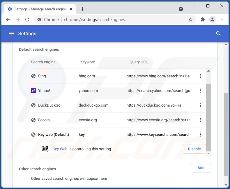 When Key Web was installed onto our test system, it made modifications to the browser's settings in order to cause redirects to keysearchs.com. We were forced to visit this fraudulent search engine every time a new browser tab/window was opened, or a search query was typed into the URL bar. Browser-hijacking software also uses persistence-ensuring features to prevent browser recovery, and Key Web is not an exception.