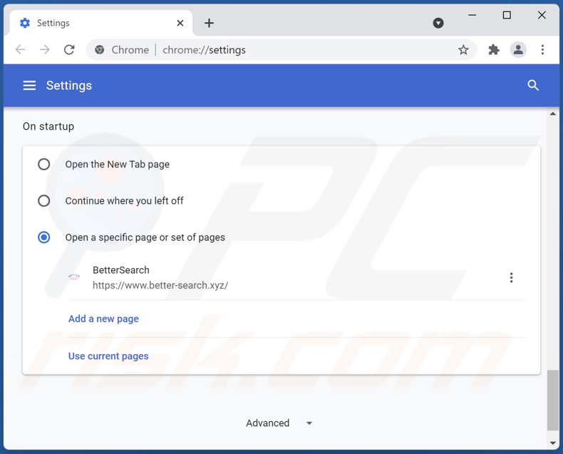 (at the top right corner of Google Chrome), select "Settings". In the "On startup" section, disable "BetterSearch Default Search" (or simply "BetterSearch"), look for a browser hijacker URL (hxxp://www.better-search.xyz) below the “Open a specific or set of pages” option. If present click on the three vertical dots icon and select “Remove”.
