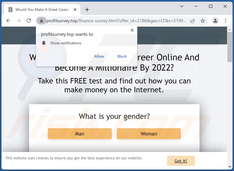Profitsurvey[.]top is a shady website that our team has discovered while examining torrent sites, illegal movie streaming pages, and other websites that use rogue advertising networks. We have analyzed profitsurvey[.]top and learned that it asks for permission to show untrustworthy notifications, displays a fake survey, and redirects to other shady pages.