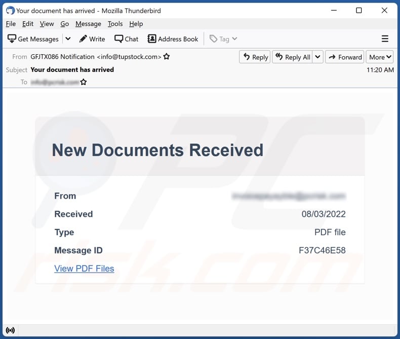In such attacks, cybercriminals' main goal is to trick their potential victims into opening an infected email attachment. To achieve this goal, email messages usually talk about recently received invoices, faxes, or voice messages.