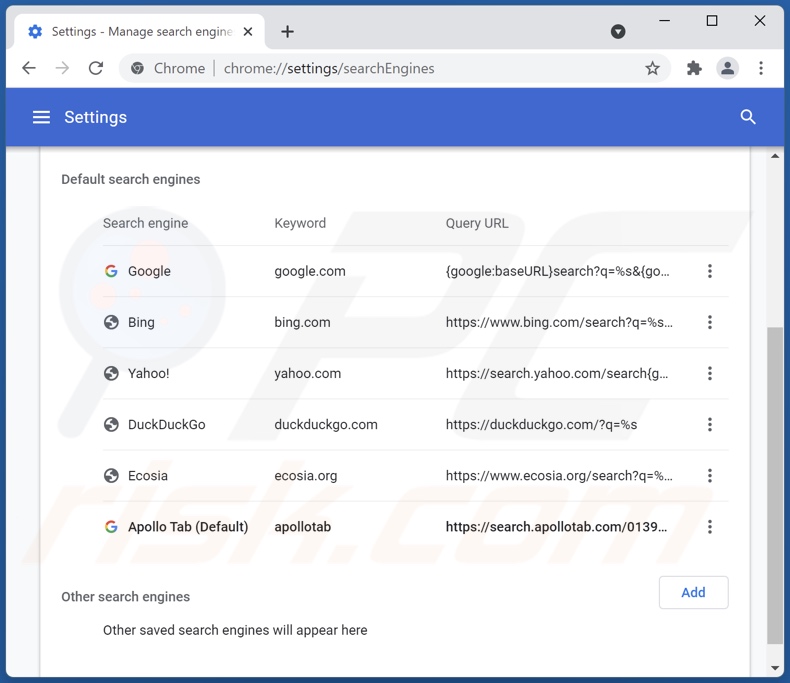 Once installed onto our test system, Apollo Tab assigned search.apollotab.com as the browser's homepage, default search engine, and new tab/window URLs. Therefore, when a new browser tab/window was opened, or a search query was typed into the URL bar - it caused a redirect to the search.apollotab.com website. Furthermore, Apollo Tab employs persistence-ensuring techniques to prevent browser recovery.