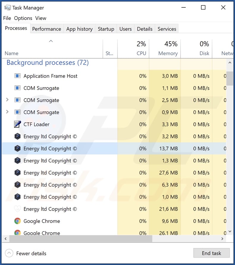 Screenshots of Energy adware's processes on Windows Task Manager (names of processes - "Energy ltd Copyright ©", "Energy Technologies Copyright ©", "Energy software Copyright © all rights reserved", "Energy soft © 2022", "Energy app Copyright © All rights reserved"):