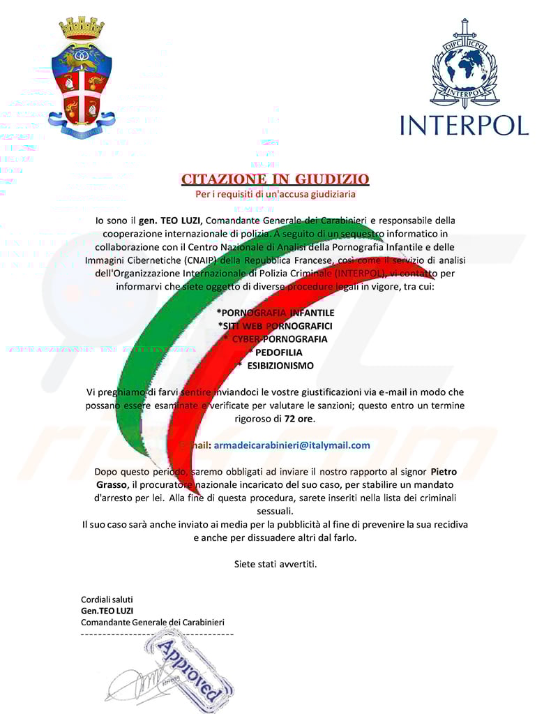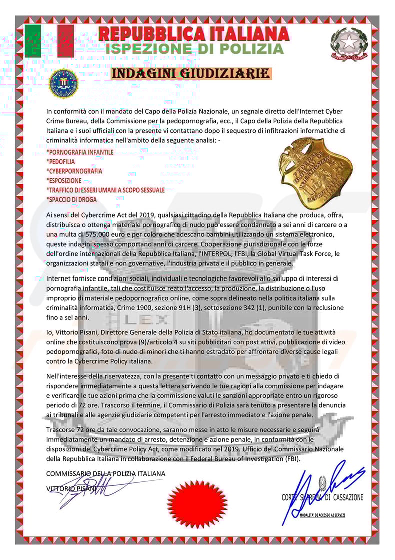 Po kibernetinių infiltracijų konfiskavimo, bendradarbiaudamas su Nacionaliniu pornografijos, vaikų pornografijos ir "Cybercast" svetainių vaizdų analizės (CNAIP) ir Tarptautinės kriminalinės policijos organizacijos (INTERPOL) analizės tarnyba, susisiekiau su jumis, kad praneščiau, jog jums taikomas tam tikras teisinis procesas, įskaitant: