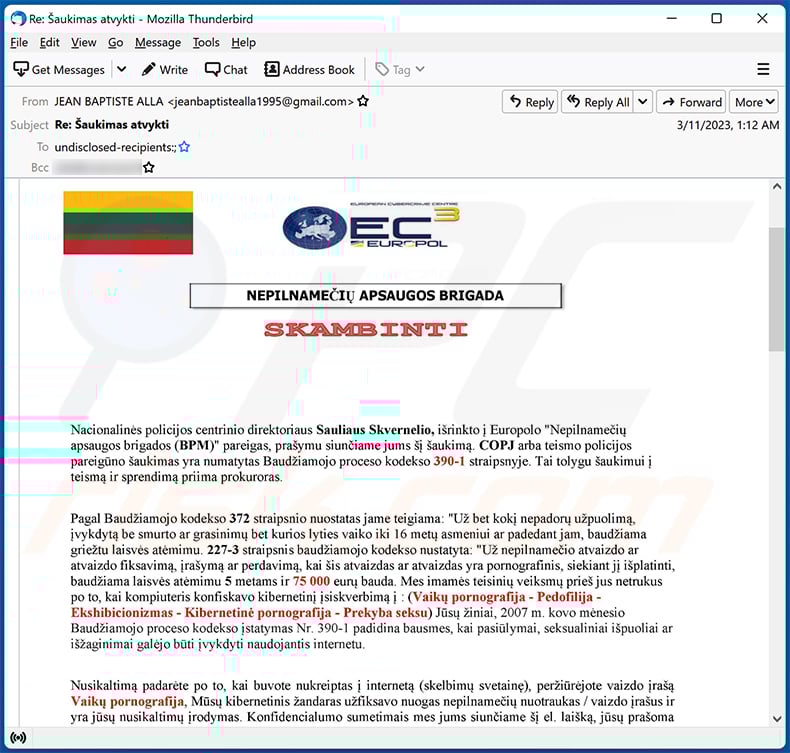 Appearance of the Lithuanian variant of the "Summon To Court For Pedophilia" spam email (GIF):