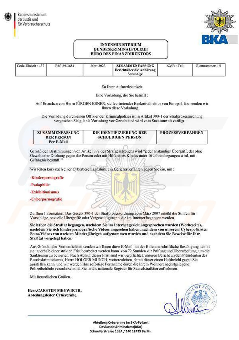 However, it must be emphasized that the "Summon To Court For Pedophilia" emails are fake. Furthermore, the French Interior Ministry has issued warnings against trusting these letters.
