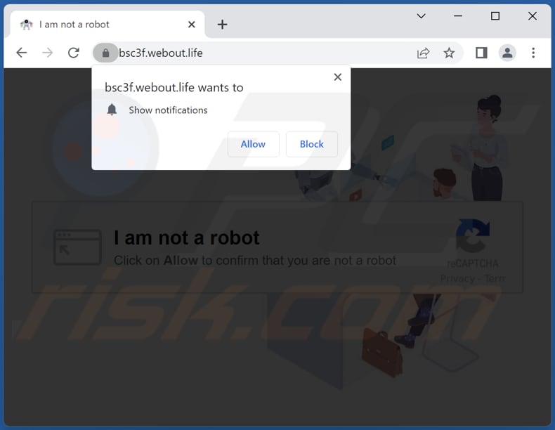 Webout[.]life displays a fake CAPTCHA instructing visitors to click the "Allow" button to confirm that they are not robots. It uses a deceptive method to get permission to display notifications. As a rule, notifications from pages like webout[.]life promote various scam websites, shady applications, and even malicious pages/apps.