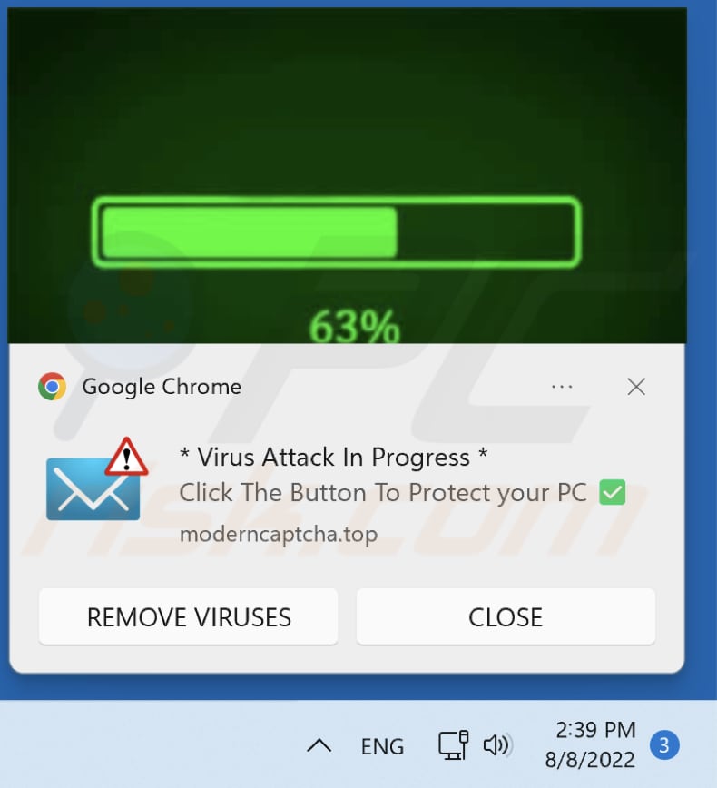 Websites like moderncaptcha[.]top promote other shady websites (e.g., phishing pages, sites running various scams) and questionable/potentially malicious applications. They are not considered to be viruses.