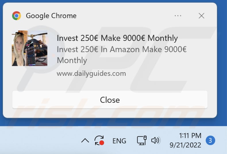 Also, dailyguides.com can show deceptive notifications (if allowed). We found that dailyguides.com displays notifications promoting various investment scams. Those notifications can open other untrustworthy pages as well. Thus, it is strongly recommended not to agree to receive notifications from suspicious sites (including dailyguides.com).