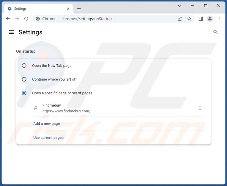 (at the top right corner of Google Chrome), select "Settings". In the "On startup" section, disable the malicious extension (if present), look for a browser hijacker URL (hxxp://www.findmebuy.com) below the "Open a specific or set of pages" option. If present click on the three vertical dots icon and select "Remove".