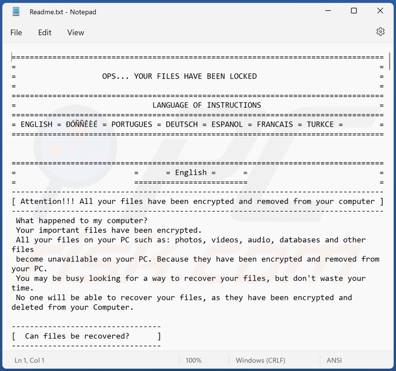 Locked_fille operates by renaming victims' files and by creating a ransom note. The message in the text file is presented in the English, Russian, Portuguese, German, Spanish, French, and Turkish languages. The note falsely claims that the files modified by Locked_fille have been encrypted.