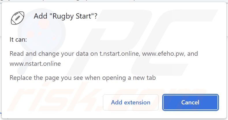 Rugby Start is a rogue browser extension that our research team found during a routine investigation of untrustworthy websites. This piece of software is promoted as a quick-access tool for Rugby results and related news. After analyzing Rugby Start, we determined that it operates as a browser hijacker and promotes (by causing redirects to) the search.nstart.online fake search engine.