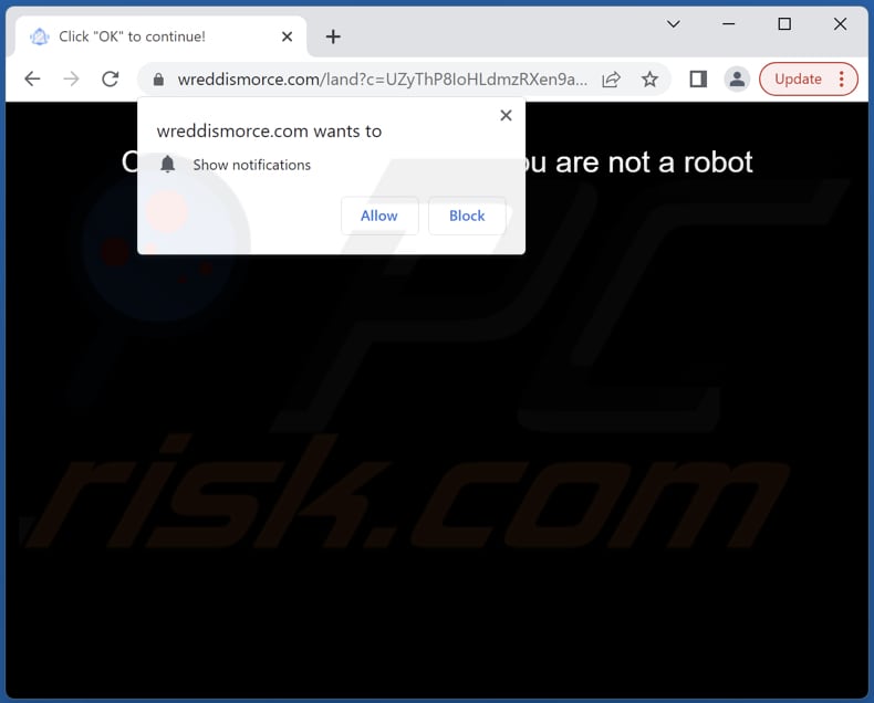 Websites receive permission to show notifications after clicking the "Allow" button displayed by a browser. They cannot deliver notifications without permission. Typically, pages like wreddismorce[.]com display deceptive messages claiming that it is required to click the "Allow" to perform required actions.