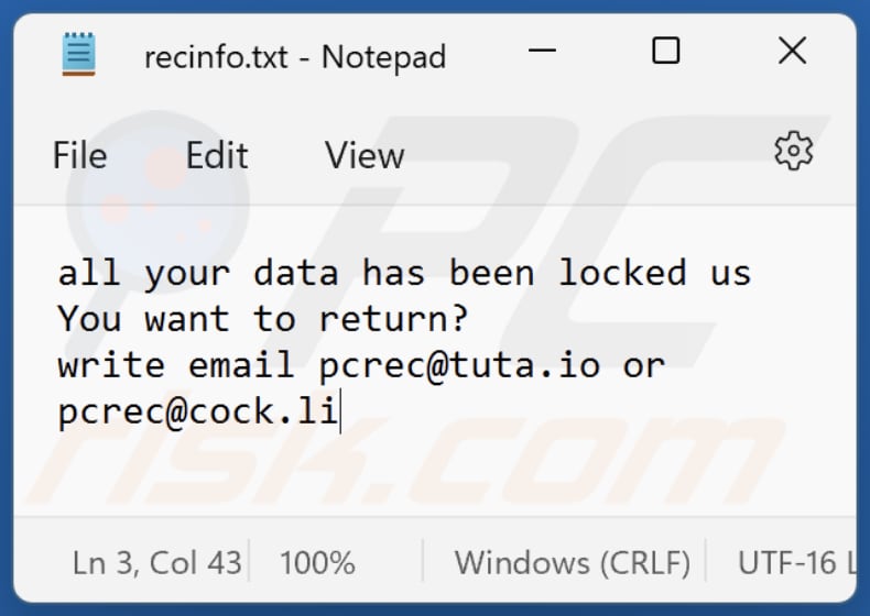 Both RPC's ransom notes state that victims must contact cybercriminals via pcrec@tuta.io or pcrec@cock.li email address if they want to decrypt files. The ransom note in a pop-up window also says that victims should not rename files or try to decrypt them using third-party software. Doing that may cause permanent data loss.